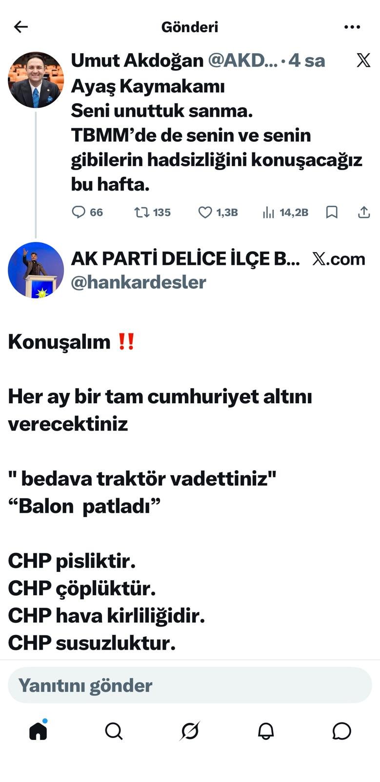 Kırıkkale’nin Delice ilçesinde AK Parti İlçe Başkanı Ercan Han, yaptığı açıklamalarda CHP’li belediyelere yönelik sert eleştirilerde bulunurken, CHP Ankara Milletvekili ve Anayasa Komisyonu Üyesi Umut Akdoğan’a da sosyal medya üzerinden yanıt verdi.