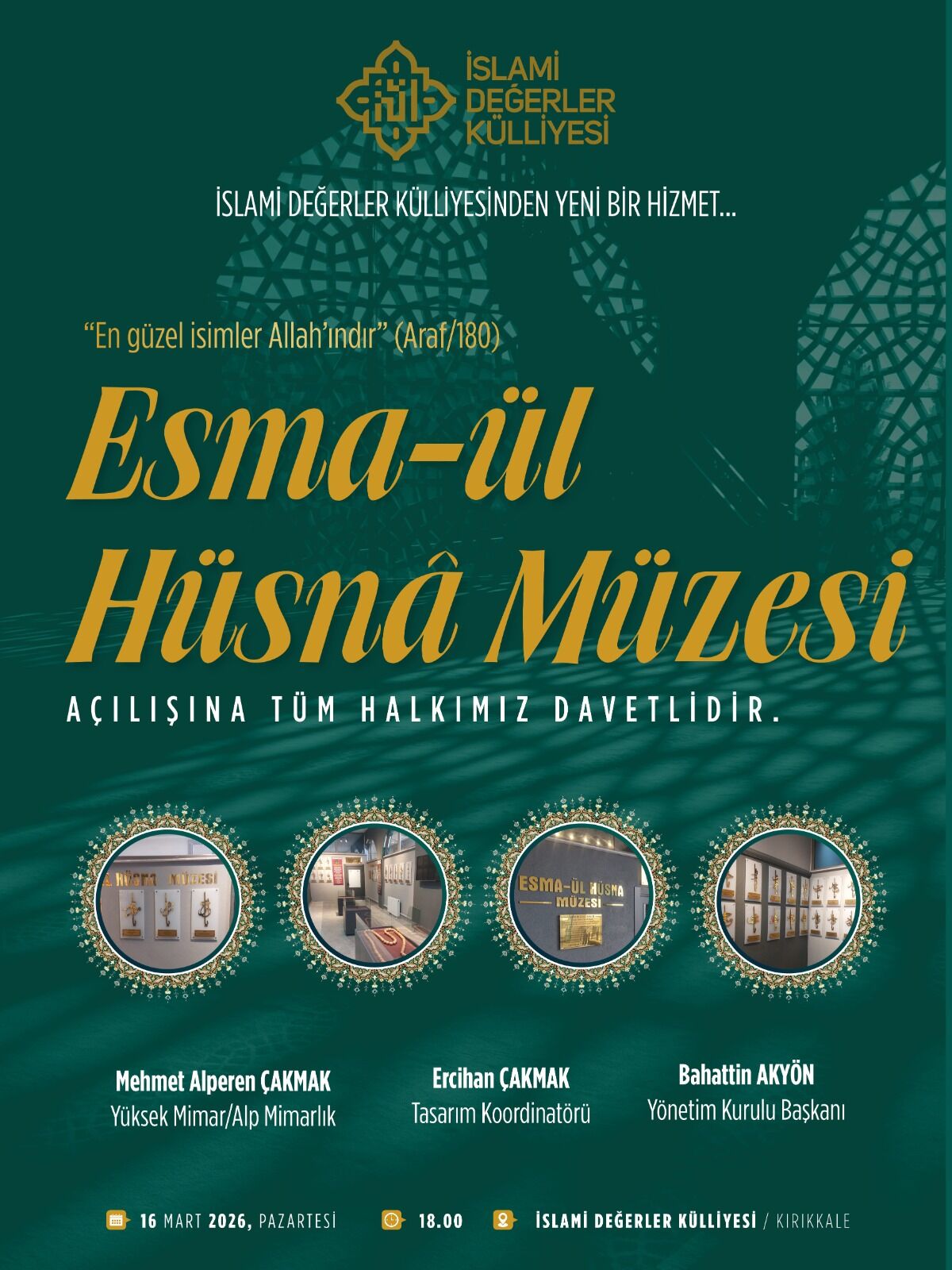 “En güzel isimler Allah’ındır” ayeti (Araf 180) ilham alınarak hazırlanan müzenin açılış programı, 16 Mart 2026 Pazartesi günü saat 18.00’de Kırıkkale İslami Değerler Külliyesi’nde gerçekleştirilecek. Açılışa tüm vatandaşların davetli olduğu bildirildi.