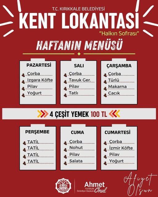 Kırıkkale Belediyesi tarafından hizmete sunulan Kent Lokantası’nda haftanın menüsü belli oldu. Uygun fiyatlı ve sıcak yemek hizmeti sunan lokantada vatandaşlara 4 çeşit yemek 100 TL’den sunulacak.