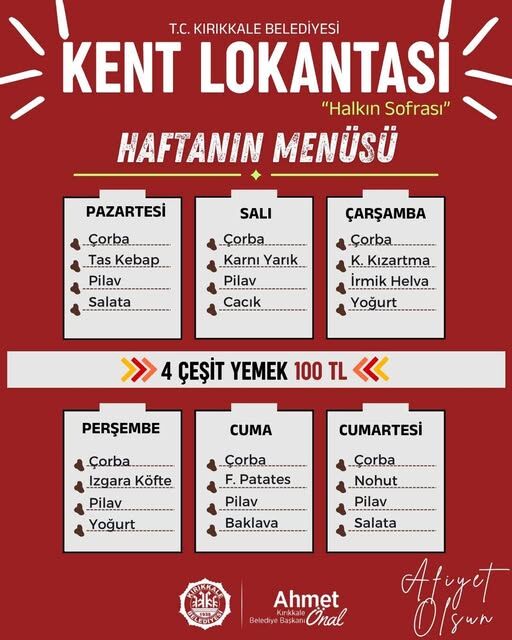 Kırıkkale Belediyesi tarafından hizmet veren Kent Lokantası’nın haftalık yemek menüsü belli oldu. Vatandaşlara uygun fiyatlı yemek imkânı sunan lokantada haftanın her günü farklı menüler hazırlanırken, 4 çeşit yemeğin 100 TL olduğu bildirildi.