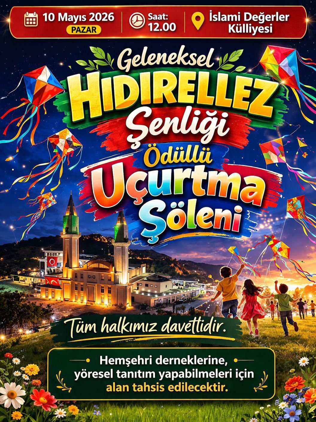 İslami Değerler Külliyesi’nde saat 12.00’de başlayacak programda, her yaştan vatandaşın katılabileceği çeşitli etkinlikler yer alacak. Baharın gelişi ve doğanın uyanışını simgeleyen Hıdırellez kapsamında düzenlenecek şenlikte özellikle çocuklar ve gençler için uçurtma etkinlikleri organize edilecek. Gökyüzünün rengarenk uçurtmalarla şenlenmesi bekleniyor.