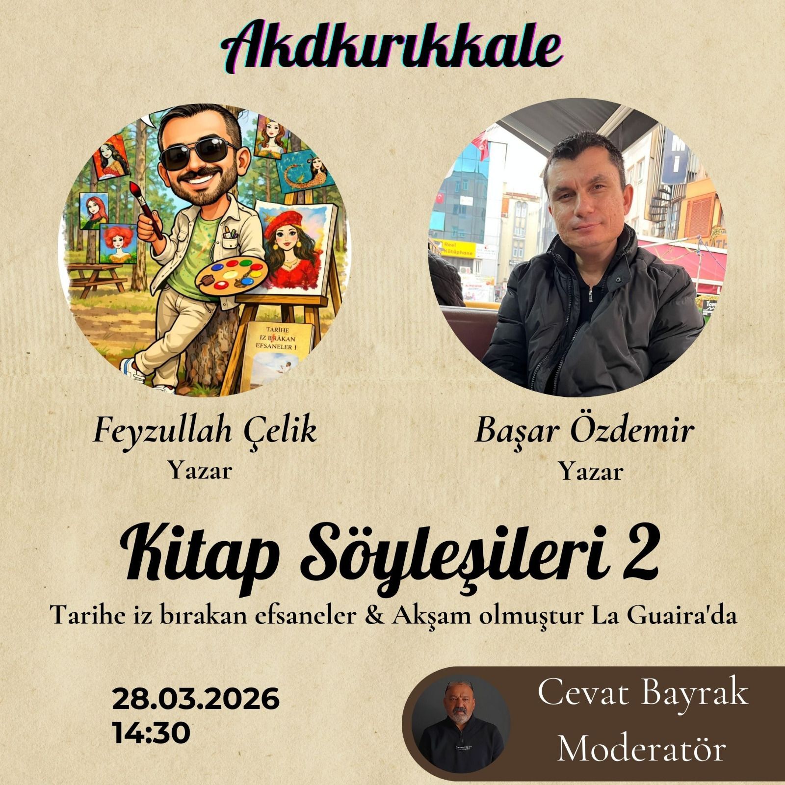 Programda yazarlar Feyzullah Çelik ve Başar Özdemir kitapseverlerle buluşacak. Söyleşide “Tarihe İz Bırakan Efsaneler” ve “Akşam Olmuştur La Guaira’da” adlı eserler üzerine sohbet gerçekleştirilecek. Etkinliğin moderatörlüğünü Cevat Bayrak yapacak.