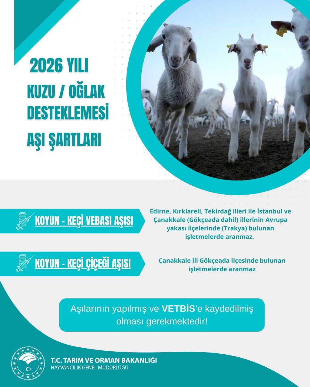 Yapılan açıklamaya göre, işletmelerde doğan tüm kuzu ve oğlakların destekleme kapsamına alınabilmesi için PPR (Koyun-Keçi Vebası) aşısı ile Koyun-Keçi Çiçeği aşısının yapılmış olması ve bu işlemlerin Veteriner Bilgi Sistemi (VETBİS) kayıtlarına işlenmesi zorunlu olacak.