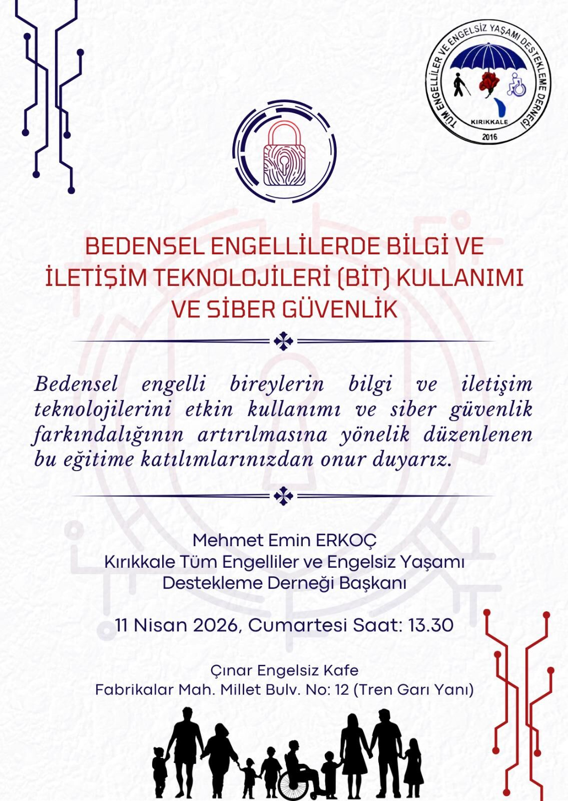 Kırıkkale Tüm Engelliler ve Engelsiz Yaşamı Destekleme Derneği tarafından organize edilen eğitimde, katılımcılara dijital dünyada güvenli hareket etme, bilgi teknolojilerini etkin kullanma ve siber tehditlere karşı bilinç kazanma konularında bilgilendirme yapılacak.