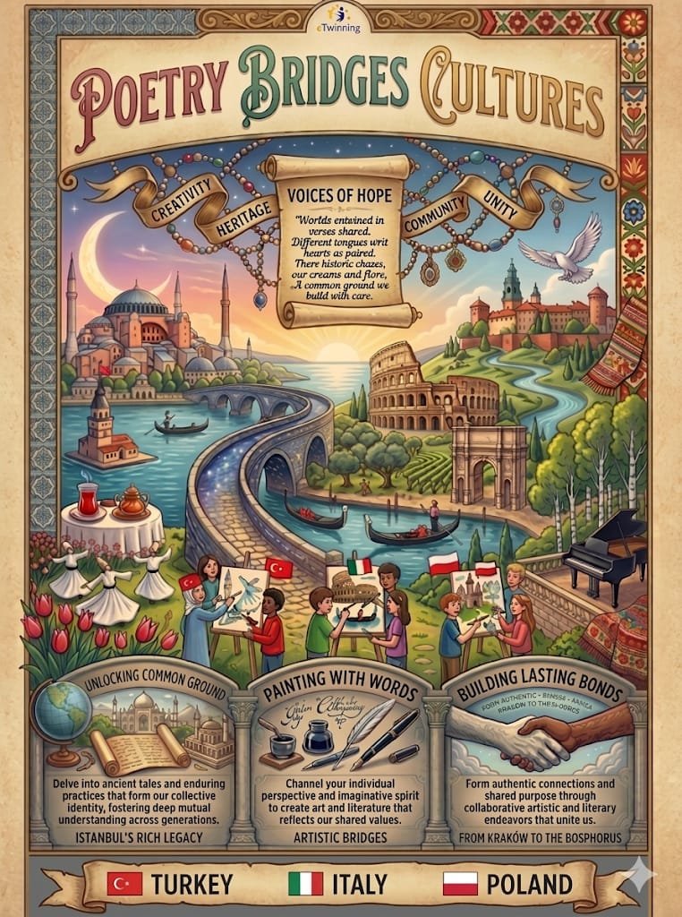Farklı ülkelerden öğrencileri şiirin evrensel dili etrafında buluşturan “Poetry Bridges Cultures” adlı eTwinning projesi, kültürler arası etkileşime önemli katkı sunmaya devam ediyor. Türkiye, Polonya ve İtalya başta olmak üzere çeşitli ülkelerden katılımcıların yer aldığı projede, Kırıkkale Atatürk Ortaokulu da aktif rol alıyor.
