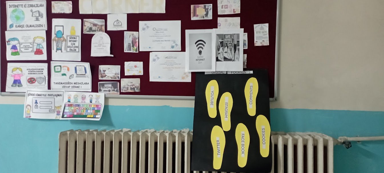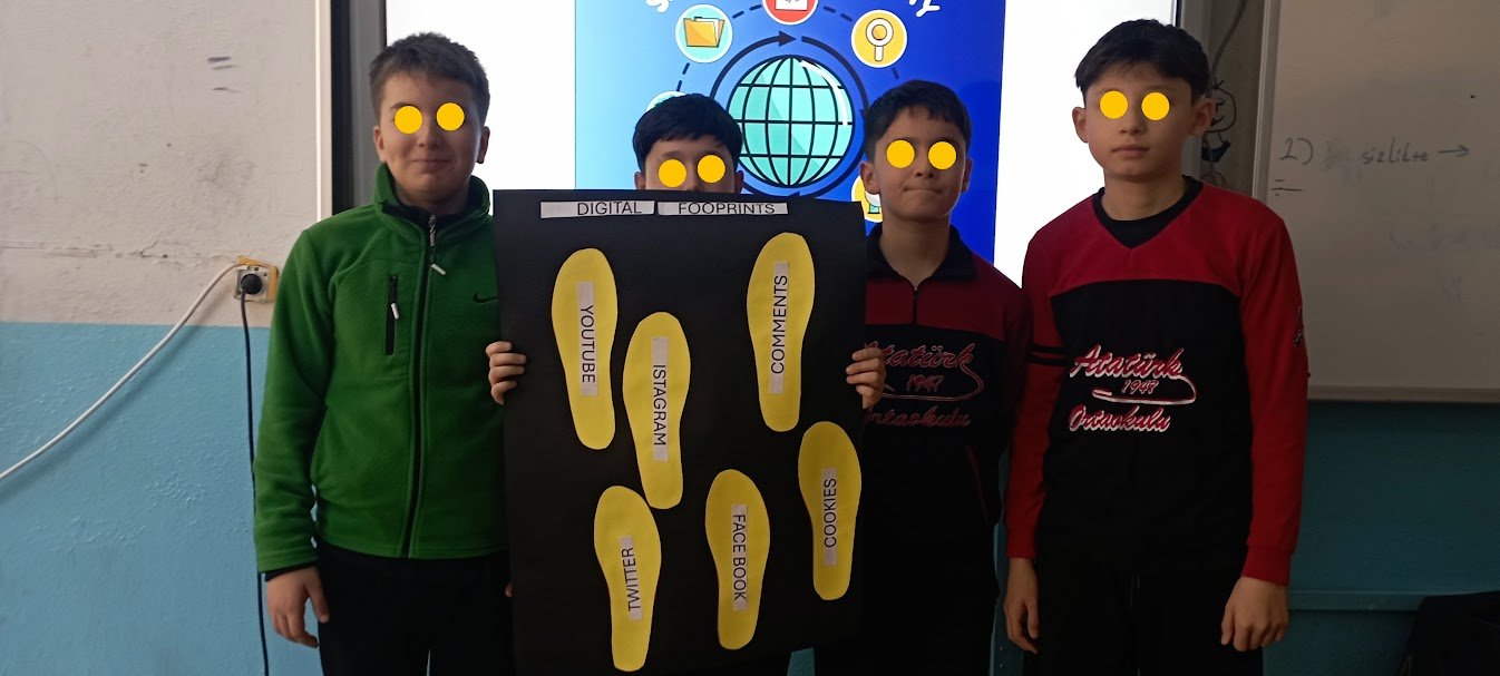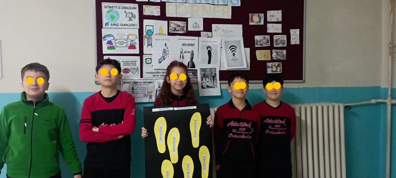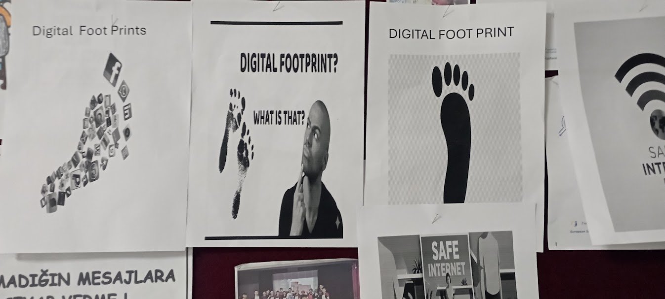 Öğrenciler tarafından dijital ayak izi konusunda da farkındalık çalışmaları gerçekleştirildi. Dijital ayak izinin ne olduğu, nasıl oluştuğu ve nelere dikkat edilmesi gerektiği konularında hazırlanan çalışmalar okul panosunda sergilenerek tüm öğrencilerin bilgilenmesi sağlandı.
