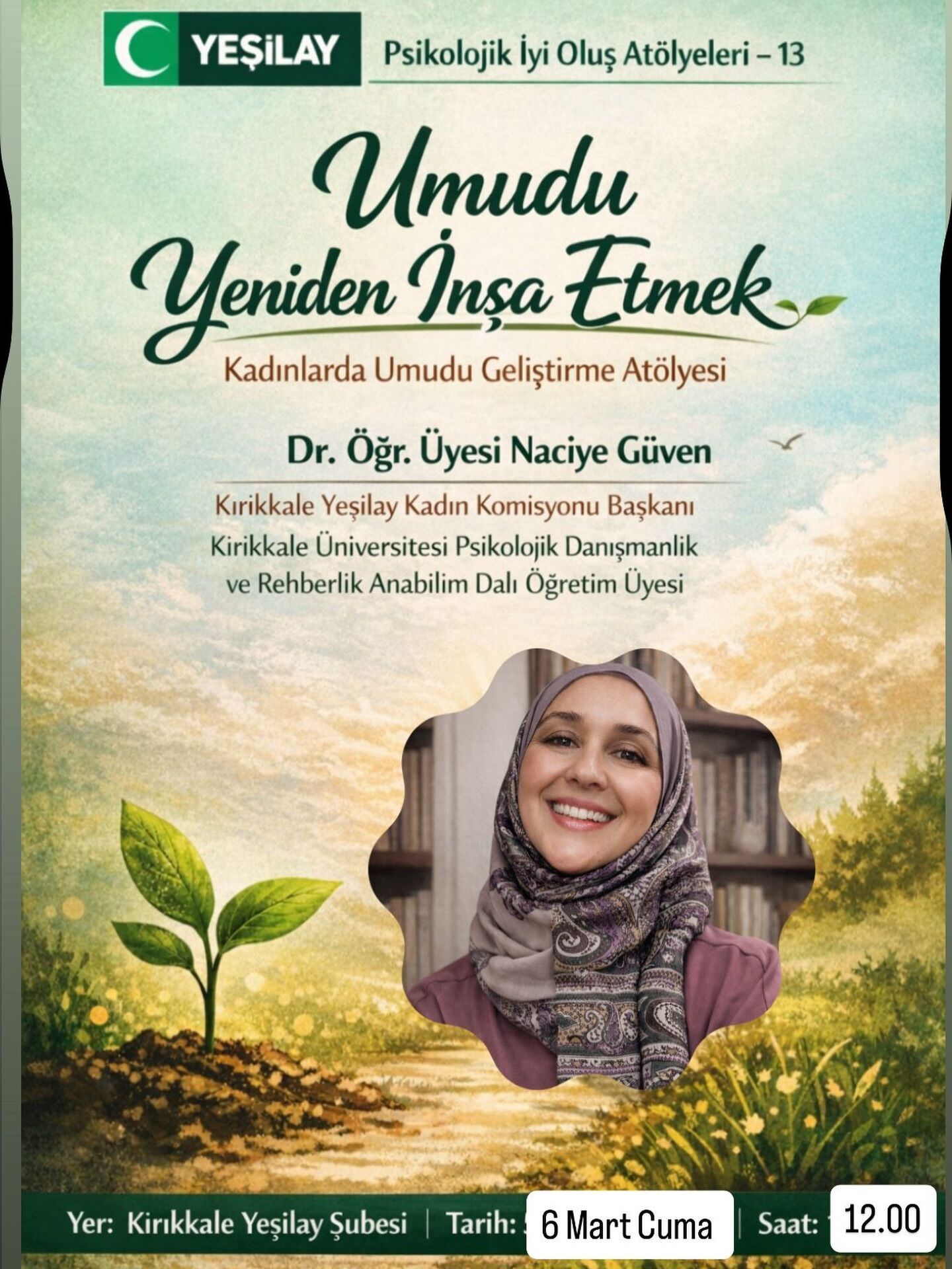 1–7 Mart Yeşilay Haftası kapsamında Yeşilay Kırıkkale Şubesi tarafından düzenlenen Psikolojik İyi Oluş Atölyeleri devam ediyor. Programın 13’üncüsü, “Umudu Yeniden İnşa Etmek” temasıyla gerçekleştirilecek.