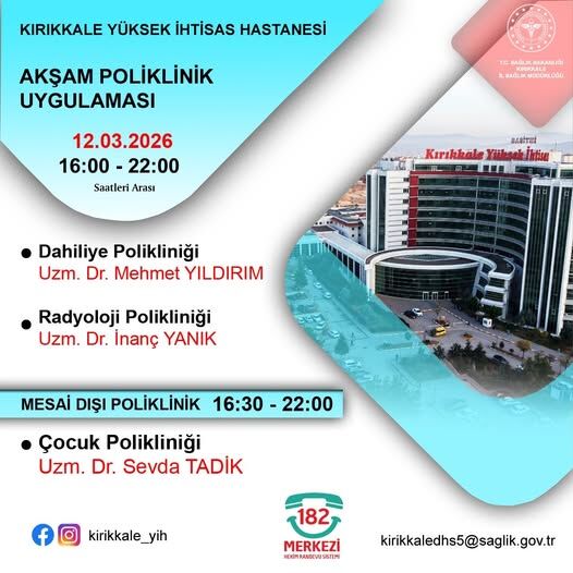Kırıkkale Yüksek İhtisas Hastanesi, vatandaşların sağlık hizmetlerine daha kolay ulaşabilmesi için akşam mesai uygulamasını sürdürüyor. 12 Mart 2026 Perşembe günü 16.00–22.00 saatleri arasında üç poliklinikte hizmet verileceği açıklandı.