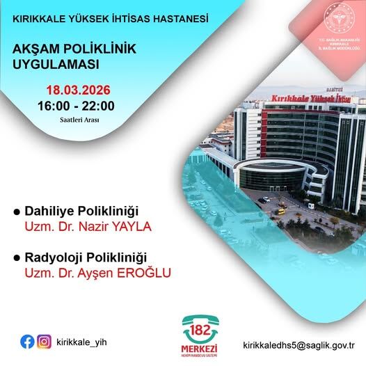 Kırıkkale Yüksek İhtisas Hastanesi, vatandaşların sağlık hizmetlerine daha kolay ulaşabilmesi için akşam mesai uygulamasını sürdürüyor. 18 Mart 2026 Çarşamba günü 16.00–22.00 saatleri arasında iki poliklinikte hizmet verileceği açıklandı.