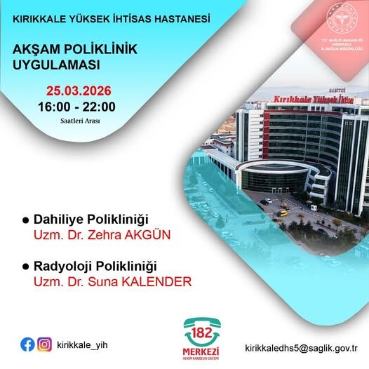 Kırıkkale Yüksek İhtisas Hastanesi, vatandaşların sağlık hizmetlerine daha kolay ulaşabilmesi için akşam mesai uygulamasını sürdürüyor. 25 Mart 2026 Çarşamba günü 16.00–22.00 saatleri arasında iki poliklinikte hizmet verileceği açıklandı.