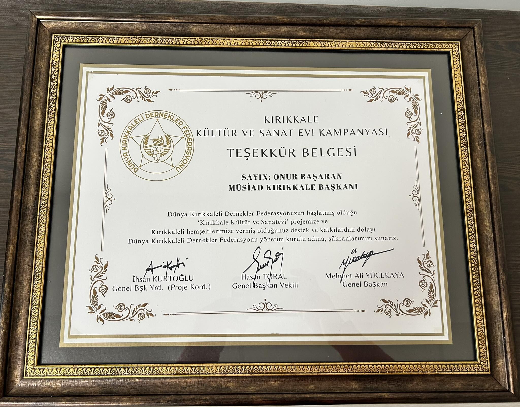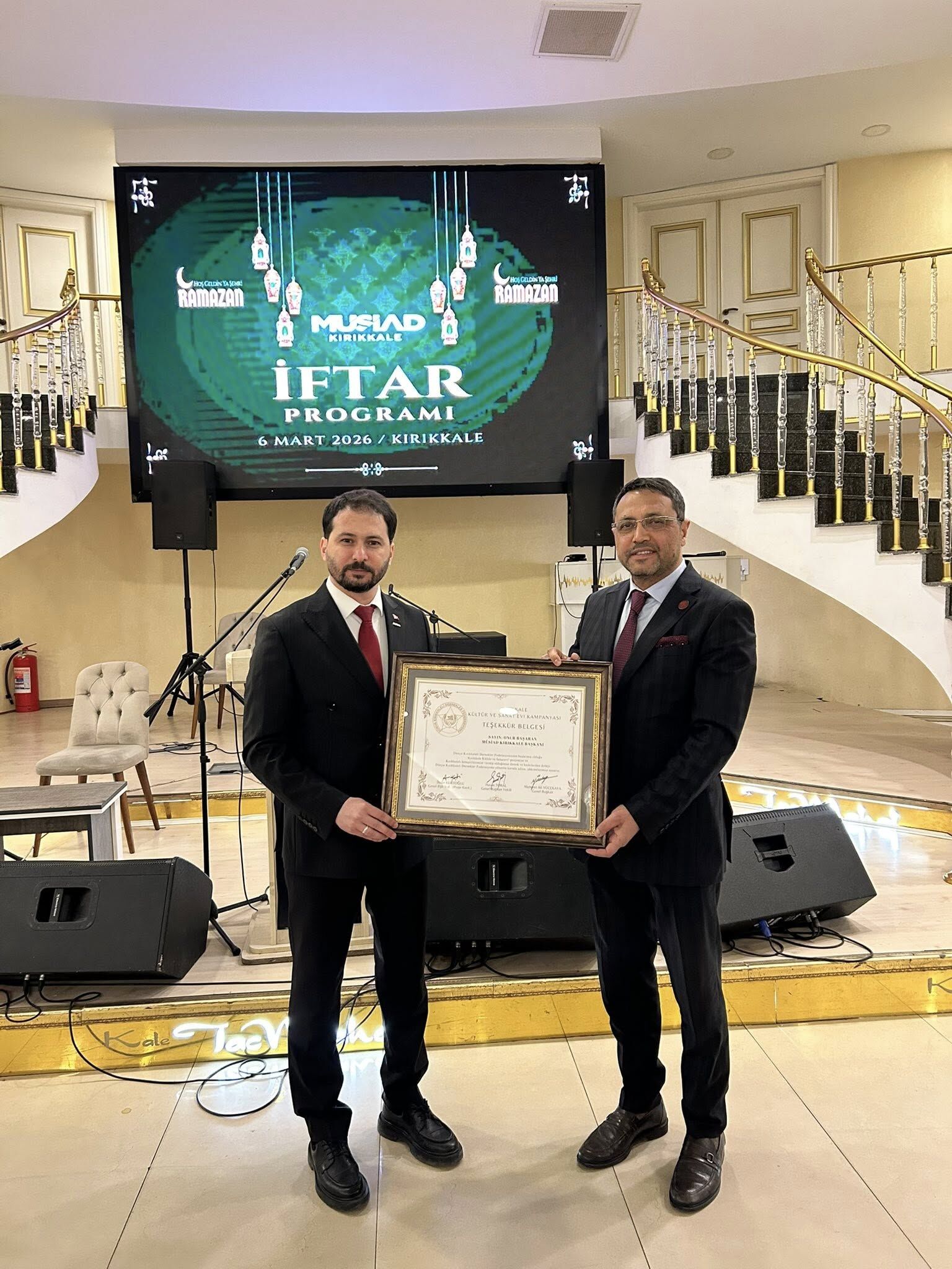 Programda konuşan Dünya Kırıkkaleli Dernekler Federasyonu Başkanı Mehmet Ali Yücekaya, Kırıkkale Kültür ve Sanat Evi Projesi’ne verdiği desteklerden dolayı MÜSİAD Başkanı Onur Başaran’a teşekkür ederek kendisine teşekkür belgesi takdim etti. Yücekaya, şehrin kültürel ve sosyal projelerine verilen katkıların büyük önem taşıdığını ifade etti.